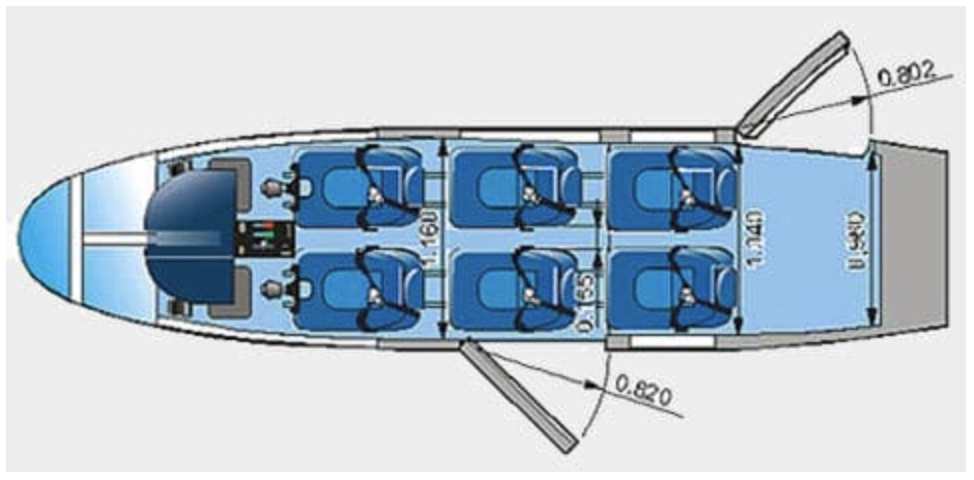 This view shows a standard 1+5 seat interior layout of P68 OBSERVER 2 including the arrangement of the cockpit crew, passenger cabin and baggage compartment with the large aft RH Cargo door and the LH Passenger entrance door.